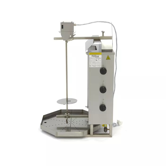 Bei diesem Grillmodell befindet sich ein zuverlässiger Motor an der Oberseite des Geräts. An der Unterseite ist eine Tropfschale aus Edelstahl angebracht, die zur einfachen Reinigung auch herausgenommen werden kann. Dieser Gyros-Grill verfügt nicht über Edelstahl-Reflexionsgitter an den Seiten. Da dieser Dönergrill mit Gas betrieben wird, erhalten Sie Standarddüsen für Erdgas (20 - 25 mbar). Die Düsen für LPG (Propan/Butan) werden separat (30 - 50 mbar) in einer Plastiktüte zusammen mit der Bedienungsanleitung geliefert. Lassen Sie die Umstellung von Erdgas auf Flüssiggas immer von einem Fachmann durchführen. Sie können beim Kauf auch ein Dönermesser mitbestellen, um das gegrillte Fleisch in hauchdünne Scheiben schneiden zu können.