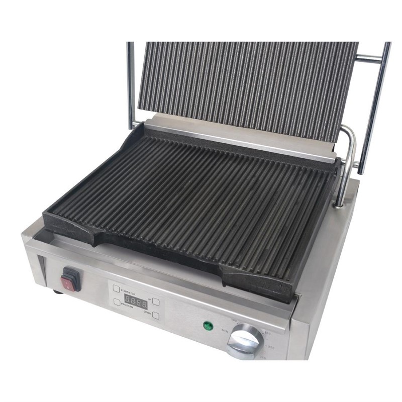 Der Buffalo Kontaktgrill hilft Ihnen, mit der Nachfrage Schritt zu halten. Mit großzügig dimensionierten gerillten Platten aus Gusseisen gibt es viel Kapazität für jede kommerzielle Umgebung. Ob Sie nun Wurst, Speck, Steaks oder Panini grillen, mit diesem Gerät können Sie dies schnell und einfach tun. Der zusätzliche digitale Timer sorgt für Präzision, während die eingebaute Tropfschale und die externe Edelstahlkonstruktion eine einfache Reinigung am Ende des Betriebs ermöglichen.