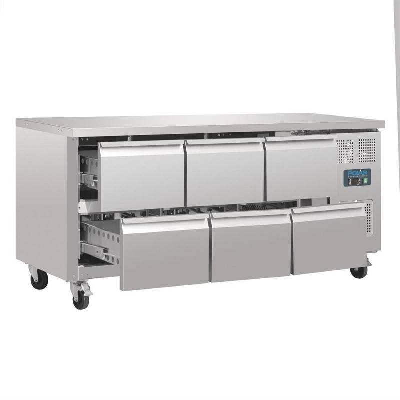Mit seiner ausgezeichneten Funktionalität und Langlebigkeit ist dieser Polar-Kühltisch ein Muss für jede beschäftigte kommerzielle Küche. Mit sechs GN1/1-kompatiblen Schubladen und Zwangskühlung ist diese vielseitige Thekenanlage perfekt im Stande, Ihre Zutaten und vorbereiteten Speisen in sogar den heißesten Küchen zu kühlen. Auf der platzeffizienten Arbeitsfläche können auch andere Geräte gestellt werden. Hergestellt aus strapazierfähigem Edelstahl und geeignet für schwere kommerzielle Nutzung.