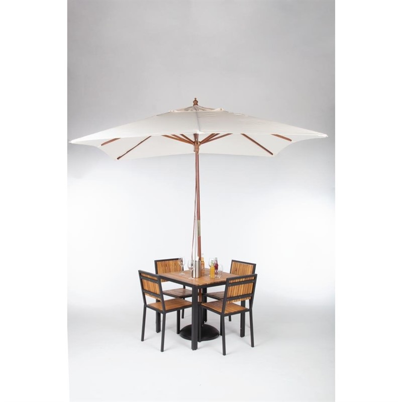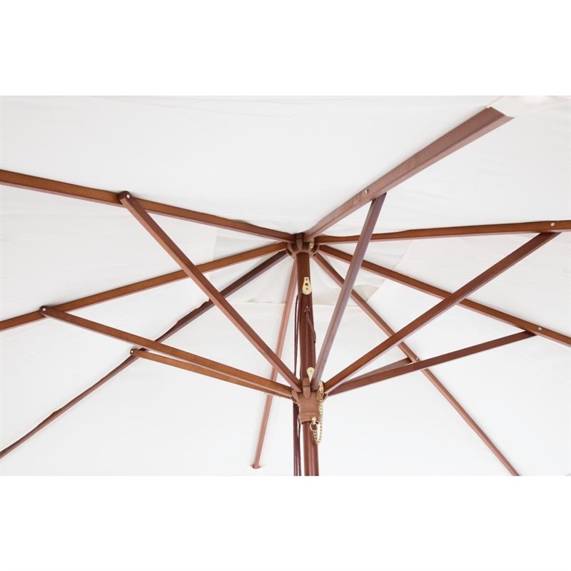 Der Sonnenschirm ist mit einem natürlichen und eleganten Holzmast und einem cremefarbenen Schirmdach ausgestattet, die jedem Außenbereich einen hochwertigen Touch verleihen und einladende Bereiche für die Gäste schaffen, die sie genießen können.