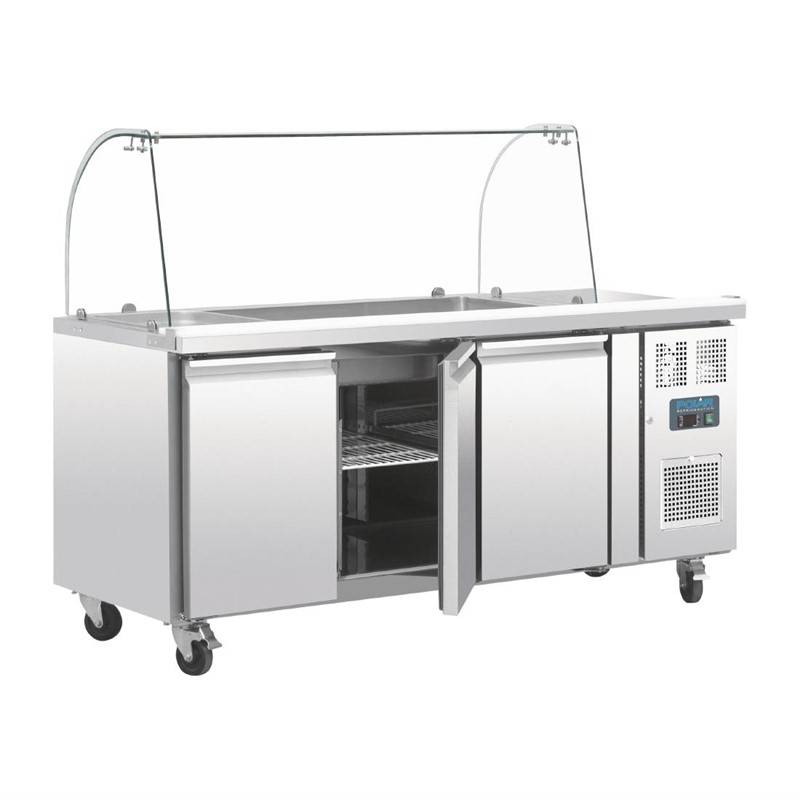 Diese zweitürige Saladette von Polar garantiert hervorragende Hygiene und Langlebigkeit zu einem angemessenen Preis. Mit Zwangskühlung, zwei Ablagen und Platz für 3 1/1 GN Behälter. Mit dieser Anlage halten Sie große Mengen Lebensmittel perfekt gekühlt und servierbereit. Dank der gläsernen Schutzhaube werden Ihre Zutaten nicht nur hygienisch sondern auch attraktiv präsentiert. Die robuste Edelstahlkonstruktion ist außergewöhnlich strapazierfähig und geeignet für die tägliche Nutzung in jeder belebten Salatbar oder Kantine. Behälter separat erhältlich.