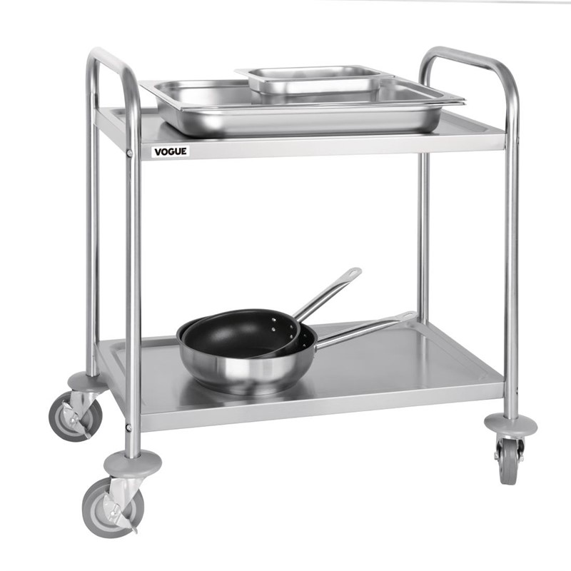 18/8-Edelstahl Abräumwagen mit 2 Etagen. Mit geräuschdämpfenden Rollen. Einfache Montage. Ladevermögen: 135kg. Der robuste und langlebige Abräumwagen von Vogue ist eine großartige Lösung für den Transport von Gegenständen zwischen verschiedenen Bereichen. Der Wagen, der durchgehend aus Edelstahl gefertigt ist, ist leicht zu reinigen und zu pflegen und bietet eine hygienische Plattform für den Transport von Utensilien, Tellern, Getränkespendern, Wäsche und Reinigungsmaterial.