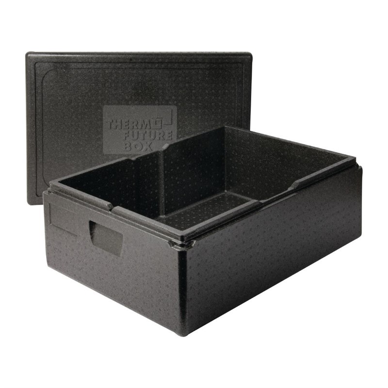Isolierte Thermobox für den Lebensmitteltransport in Bäckereien oder Metzgereien, wie Stapelbehälter, Backformen oder Tabletts im Format 60 x 60 cm. Die Thermo Future Box besteht aus expandiertem Polypropylen EPP. Das Material ist sehr strapazierfähig, leicht, spülmaschinenfest mit besten Isolationseigenschaften von minus 40°C bis plus 120°C. Thermo Future Box ist wiederverwendbar und zu 100 % recycelbar und schont die Umwelt.